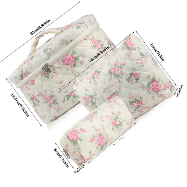 Lahka in prenosna: Te kozmetične torbice so zasnovane z mislijo na prenosljivost in so neverjetno lahke, zaradi česar jih je enostavno prenašati v prtljagi ali torbici. Kompaktna zasnova zagotavlja, da ne bodo zavzele preveč prostora, hkrati pa zagotavljajo veliko prostora za shranjevanje. Prešiti material je mehak in udoben za držanje. Popoln za popotnike, ki želijo zmanjšati težo in povečati prostor, je ta komplet praktična in elegantna izbira. Cvetlični vzorec doda pridih ženstvenosti, zaradi česar je čudovit dodatek k vašim potovalnim dodatkom. Ročni dizajn omogoča enostavno prenašanje.