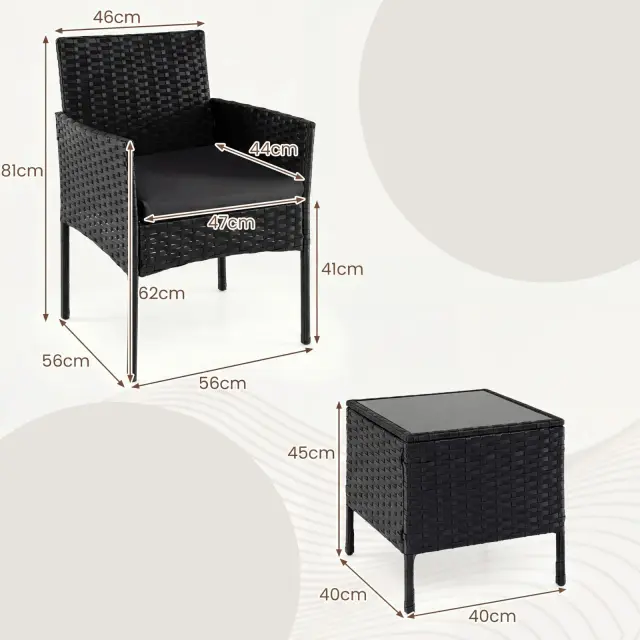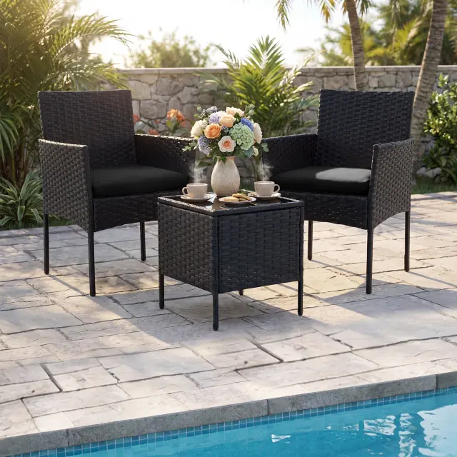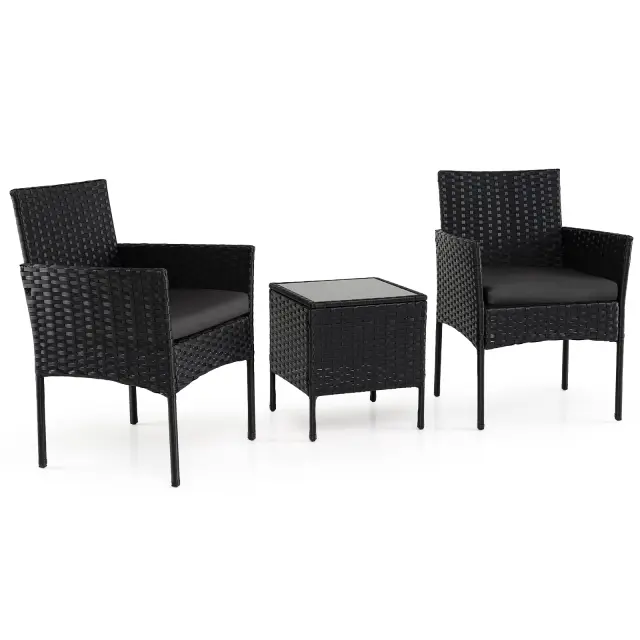 Elegantno zatočišče za sproščujoče ure na prostem: V tridelnem kompletu vrtnega pohištva sta 2 udobna stola z mehkimi oblazinjenimi blazinami in vrtna miza z robustno ploščo iz kaljenega stekla, idealna za prijetne trenutke v dvoje. Ročno tkani ratan PE zagotavlja prijetno kroženje zraka, nudi zaščito pred sončnimi žarki in je idealen za dolgotrajno uporabo na prostem. Stabilen jekleni okvir zagotavlja stabilnost, ukrivljeni nasloni za roke, visoko naslonjalo ter eleganten preplet črnega ratana in kaljenega stekla pa dajejo balkonskemu pohištvu poseben pečat.