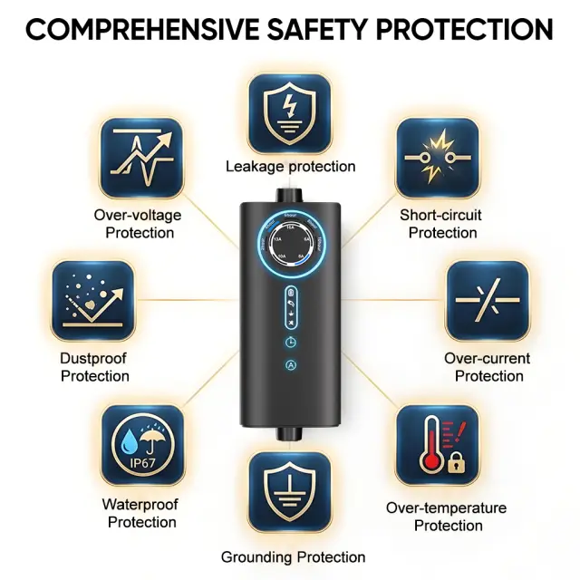 Polnilnik vključuje večplastne zaščitne funkcije: zaščito pred uhajanjem toka, prenapetostjo, prevelikim tokom, kratkim stikom, pregrevanjem in napakami ozemljitve.