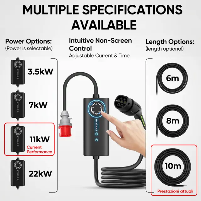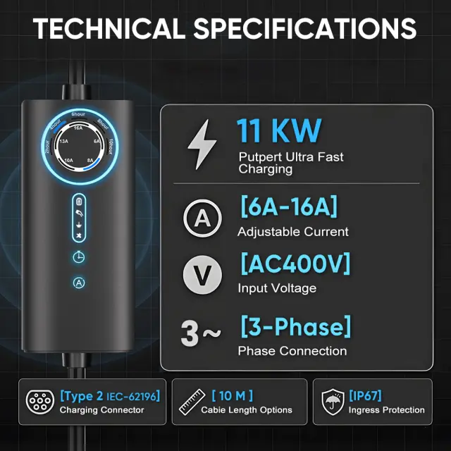 To je prenosni polnilni kabel za električna vozila brez zaslona, ki ga upravljate s tipkami na dotik. Odlikuje ga eleganten in enovit videz. Na napajalni strani je opremljen z vtičem Schuko, na strani vozila pa s priključkom tipa 2 po standardu IEC-62196. Kabel je namenjen trifaznemu polnjenju z močjo 11 kW pri toku 16 A.