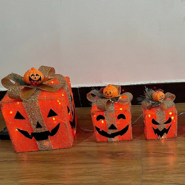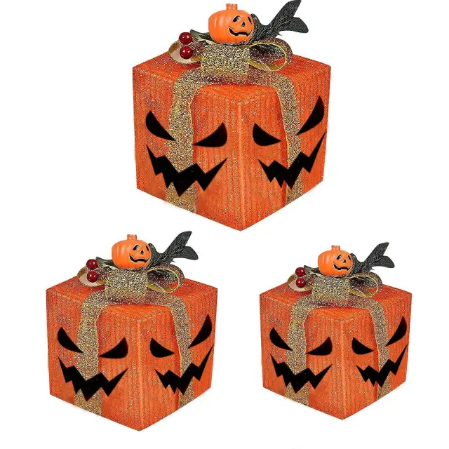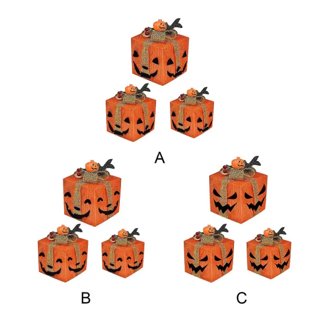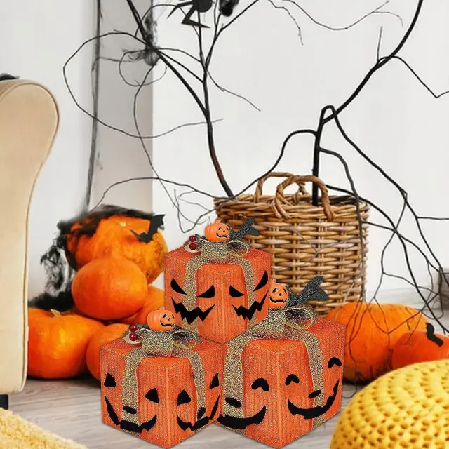 3 paketi osvetljenih bučnih okraskov za noč čarovnic z LED lučkami, darilna škatla Jack-O-Lantern na baterije