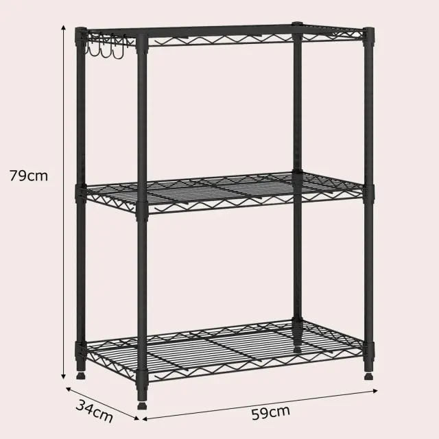 Izboljšajte svojo organizacijo s kovinsko polico, ki odlično združuje vzdržljivost in priročnost. Ta 3-stopenjska kovinska polica ima nastavljive police, ki so med seboj oddaljene 2,5 cm, in omogoča namestitev predmetov različnih velikosti. Trpežen in robusten kovinski okvir z žičnatimi mrežami v obliki črke V zagotavlja močno oporo in zanesljivost. Hitra montaža brez orodja olajša postavitev, kompleti proti prevračanju in nastavljive podloge za noge pa zagotavljajo dodatno stabilnost. Organizirajte svoj dom s tem robustnim kovinskim regalom, ki bo poskrbel za varen in urejen prostor.