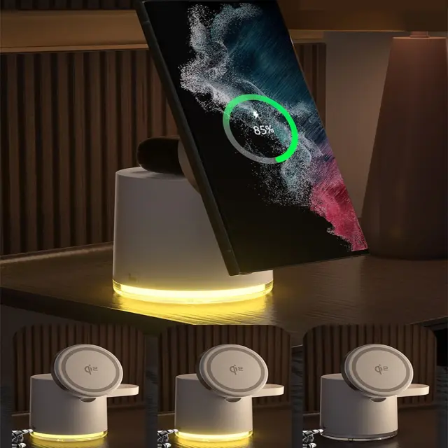 Zložljiva in prenosljiva zasnova: Zložljiva zasnova naredi ta brezžični polnilec izjemno prenosljiv in enostaven za shranjevanje. Ko ni v uporabi, ga preprosto zložite v kompaktno velikost, zaradi česar je idealen za potovanje ali ohranjanje urejenosti vaše mize. Njegova majhna površina zagotavlja, da ne bo zavzel veliko prostora v vaši torbi ali na vaši nočni omarici. Robusten zložljiv mehanizem zagotavlja, da lahko prenese večkratno uporabo, ne da bi pri tem ogrozil svojo strukturno celovitost. Ne glede na to, ali ste na službenem potovanju, počitnicah ali se preprosto premikate med sobami, ta zložljivi polnilec zagotavlja priročno in prostorsko varčno rešitev za polnjenje. Uživajte v prilagodljivosti polnjenja vaših naprav kjer koli in kadar koli, brez težav z zajetnimi polnilci in zapletenimi kabli. Elegantna in minimalistična zasnova dopolnjuje vsako okolje in doda pridih prefinjenosti vaši nastavitvi polnjenja.