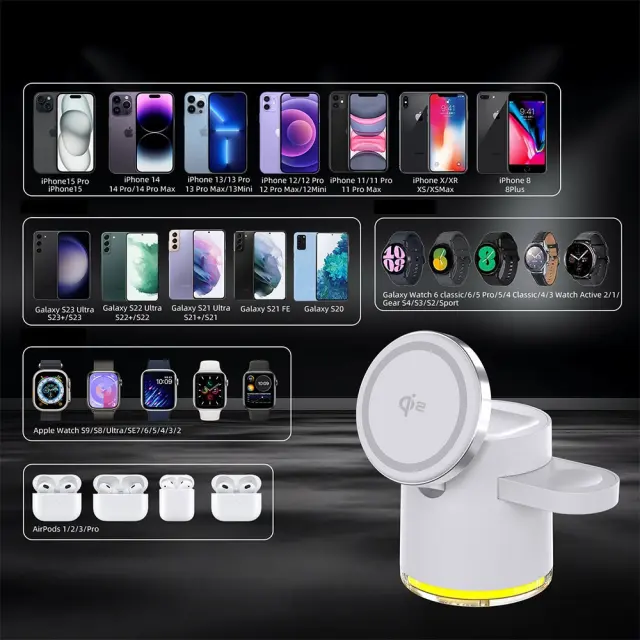 Simultano polnjenje treh naprav: Polnite svoj pametni telefon, pametno uro in brezžične slušalke hkrati s to 3-v-1 brezžično polnilno postajo. To odpravlja potrebo po več polnilcih in kablih, kar pospravi vašo delovno površino in poenostavi vašo rutino polnjenja. Je združljiva s široko paleto naprav, vključno z iPhoni, telefoni Samsung Galaxy, Apple Watch, Samsung Galaxy Watch, AirPods in drugimi napravami, ki podpirajo Qi. Izkusite udobje polnjenja vseh svojih bistvenih naprav na enem osrednjem mestu, kar vam prihrani čas in trud. Integrirana zasnova zagotavlja učinkovito dobavo energije vsaki napravi, optimizira hitrost polnjenja in varnost. Popolna za dom, pisarno ali potovanje, ta polnilna postaja ohranja vaše naprave napolnjene in pripravljene za uporabo.