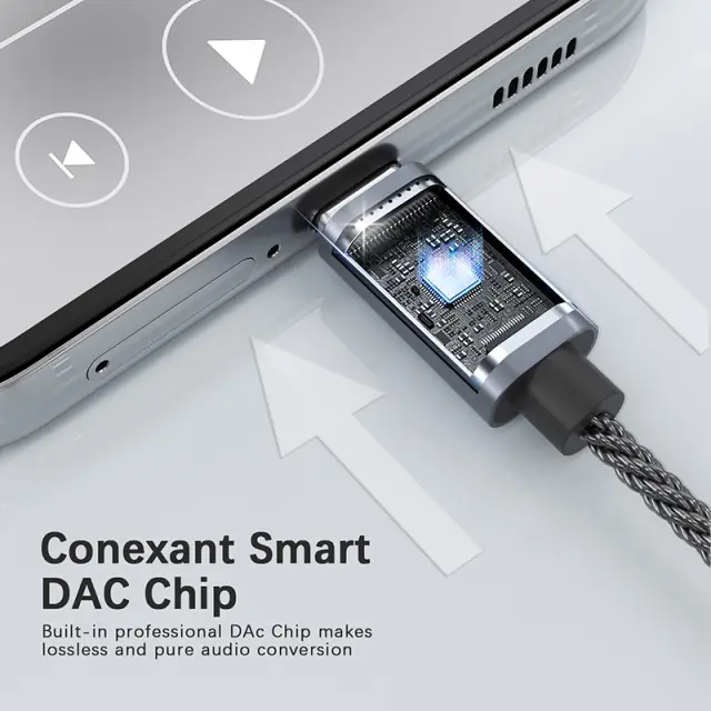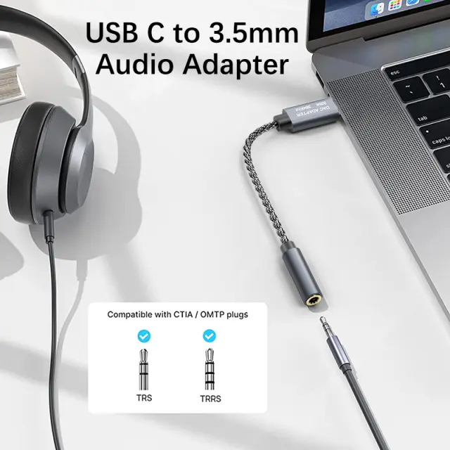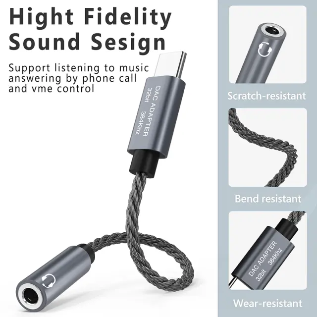 Avdio adapter z visokokakovostnim DAC, ki zagotavlja odlično kakovost zvoka. USB adapter za slušalke se poveže z napravami z USB-C, tako da lahko uporabljate žične slušalke do 32-bit/384 kHz na računalniku ali mobilnem telefonu z vtičnico USB-C.