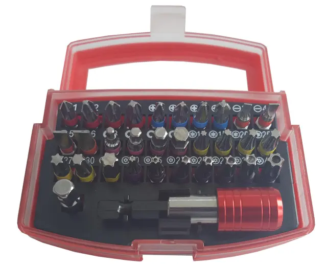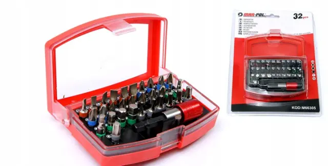 Set bitov je namenjen pritrditvi / demontaži različnih sort vijakov. Vključuje standardne bite 25 mm Set vsebuje nastavke: Philips: PH0 • PH1 x2 • PH2 x2 • PH3 Pozidriv: PZ0 • PZ1 x2 • PZ2 x2 • PZ3 Torx: T8 • T10 • T15 • T20 • T25 • T27 • T30 Stan: SL3 • SL4 • SL5 • SL5.5 • SL6 • SL7 Hex: H2 • H3 • H4 • H5 • H5,5 • H6 Torx z luknjo: T8 • T10 • T15 • T20 • T25 • T27 • T30