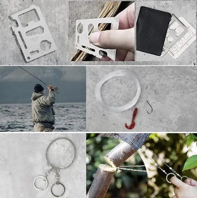 Ta izjemen komplet vsebuje vse potrebne pripomočke za preživetje in prvo pomoč, vključno z LED svetilko, ki zagotavlja svetlo in zanesljivo osvetlitev v temi. V kompletu najdete tudi nož z več funkcijami, kresilnik za ogenj, večnamensko kartico, taktično pisalo, piščalko, kompas, rešilno odejo, vrvico in še veliko več. Vsak kos je skrbno izbran, da vam pomaga v različnih situacijah, bodisi pri kampiranju, pohodništvu, ribolovu ali drugih dejavnostih na prostem.