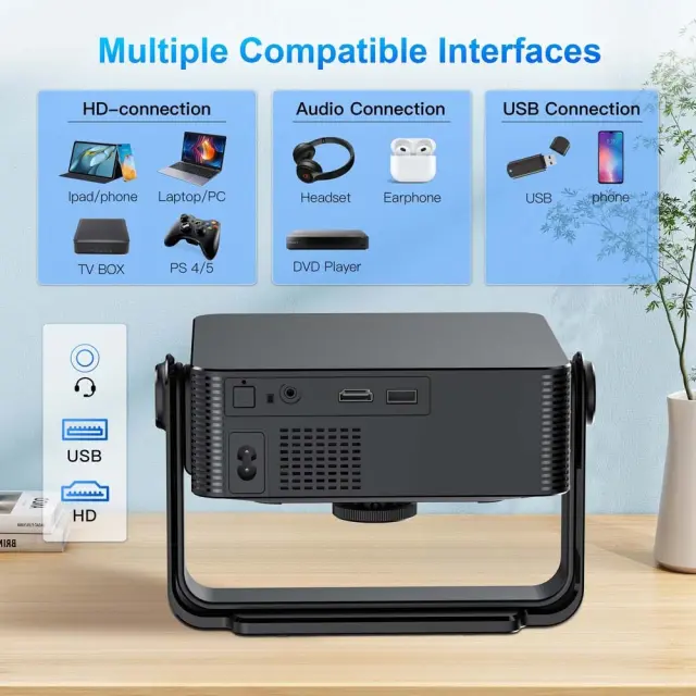 Vsestranska prilagodljivost: Z možnostjo 360-stopinjske prilagoditve ta projektor omogoča projiciranje slike na stene, strop ali katero koli drugo površino. Ne glede na to, ali gre za spalnico, dnevno sobo ali celo zunanji prostor, lahko enostavno prilagodite kot projekcije za optimalen pogled. Ta prilagodljivost zagotavlja, da lahko uživate v filmih, igrah ali predstavitvah, kjer koli želite, brez kompromisov pri kakovosti slike.