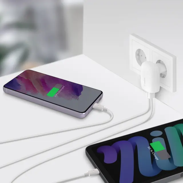 Belkinov stenski polnilnik USB-C USB 37 W lahko polni dve napravi hkrati. 25 W vrata USB-C in vrata USB-A 12 W za skupno napajanje 37 W. Vrata USB-C vam omogočajo polnjenje od 0 do 50 % v manj kot 30 minutah. Z vgrajeno tehnologijo PPS samodejno prilagaja moč polnjenja, ki jo zahteva vaša povezana naprava (25 W za Samsung/ 20 W za iPhone).
