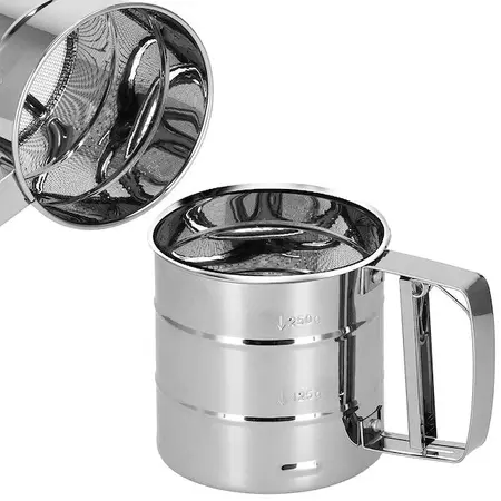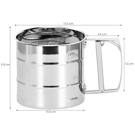 Parametri: Znamka: Springos Material: nerjaveče jeklo Barva: krom Količina moke, ki jo je mogoče presejati: 375 g Skupna višina: 9,5 cm Skupna širina: približno 15,5 cm Premer sita: približno 10,5 cm Velikost ročaja: približno 4,5 x 2 x 7,5 cm Izdelek koda: KI0044