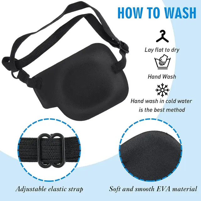 Preveza za oči je izdelana iz mehkega in gladkega materiala, ki je prijeten za nošenje. Velikost naglavnega traku lahko prilagodite tako, da se maska za oči prilega obsegu vaše glave. Očesna preveza se prilega desnemu očesu in je primerna za uporabo na primer pri motnjah vida in strabizmu.
