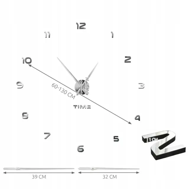 Samosestavljiva ura ima čudovit in zelo impresiven zrcalni učinek visokega sijaja. Ura najbolje izgleda s premerom od 60 (kazalci blizu številk) do 130 cm. Posamezne številke se pritrdijo s priloženim samolepilnim trakom. Ura se prilega vsaki barvi stene. Številke lahko razporedite poljubno – klasično v krog ali z vrtenjem/premikanjem, da ustvarite nepravilno kompozicijo – vse je odvisno od vas!