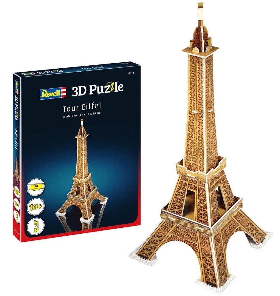 3D sestavljanka Tour Eiffel z 20 kosi. Sestavljanje s prileganjem kosov skupaj, brez lepila in brez potrebe po rezanju. Čas sestavljanja: 50 - 60 minut. Mere sestavljenega izdelka: 34 cm (višina) × 14 cm (širina). Znamka izdelka: Revell.