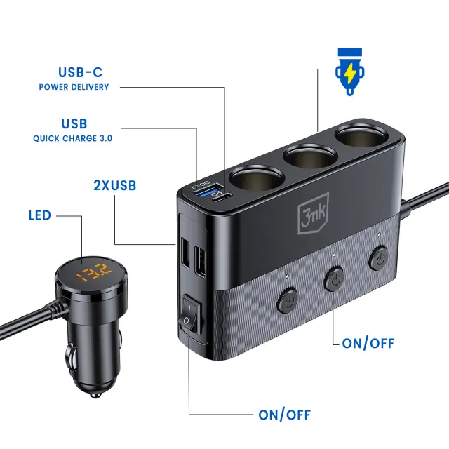 3mk, Avtomobilski polnilnik 7 v 1 s 3 vti?nicami za vžigalnik 10A PD 120W, ?rna