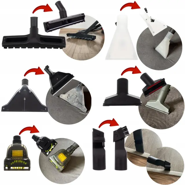 KAKO DELUJE SESALNIK? – ima sistem dveh rezervoarjev. V eno nalijte vodo in čistilno sredstvo, druga pa se samodejno napolni z uporabljeno in umazano vodo. Posoda za detergent ima prostornino 3,5 litra, posoda za umazano vodo po pranju pa 20 litrov. V kompletu je 6 nasvetov! Turbo čistilna konica za tla je namenjena čiščenju gladkih površin in preprog, odstranjuje trdovratno umazanijo, kot je živalska dlaka, zahvaljujoč vrtljivemu valju s sintetičnimi zbiralnimi elementi. Ozka šoba s premično konico je popolna na primer za čiščenje vogalov sedežnih garnitur, letev, stropov in drugih kotičkov. Majhna konica v obliki črke T, popolna za sesanje preprog, preprog in oblazinjenega pohištva. Čistilna šoba z vodnim razpršilcem, razpršilno konico in krtačo za tla.