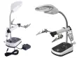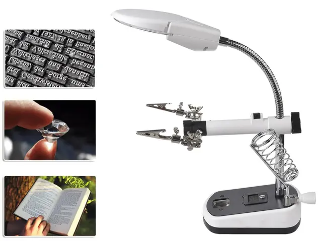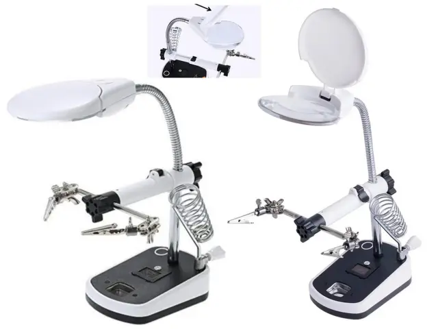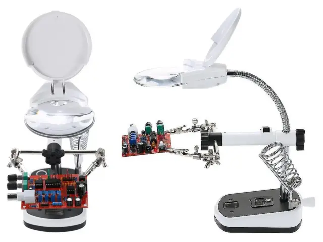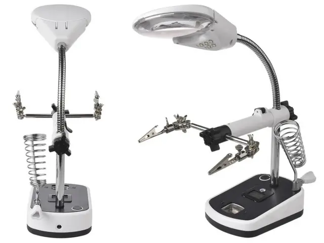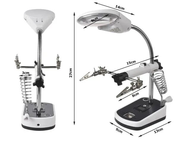 Poleg tega ima ta povečevalno steklo tudi tretjo roko, ki vam omogoča stabilno pritrditev predmetov med delom. To je še posebej koristno pri spajkanju, saj vam omogoča prostoročno delo in natančno usmerjanje spajkalnika. Tretja roka je prilagodljiva in se lahko prilagodi različnim kotom, kar vam omogoča optimalno delovno pozicijo.