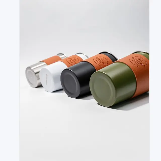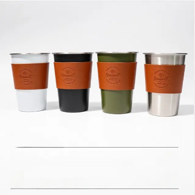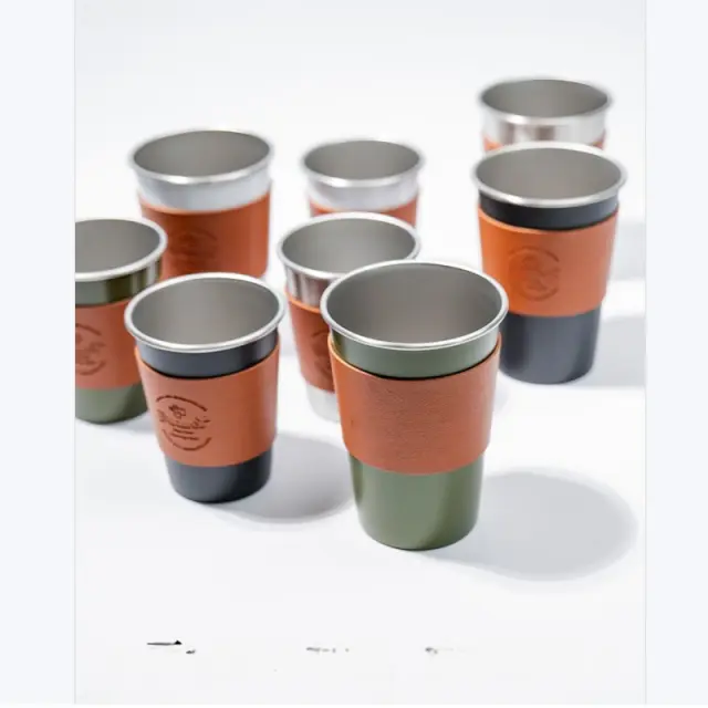 4-delni Komplet Prenosnih Majhnih Skodelic za Vino/Čaj za Kampiranje - Nerjaveče Jeklo in Usnje 350 ml