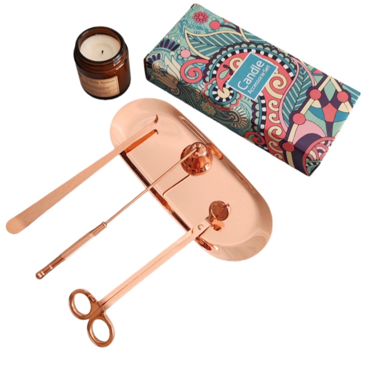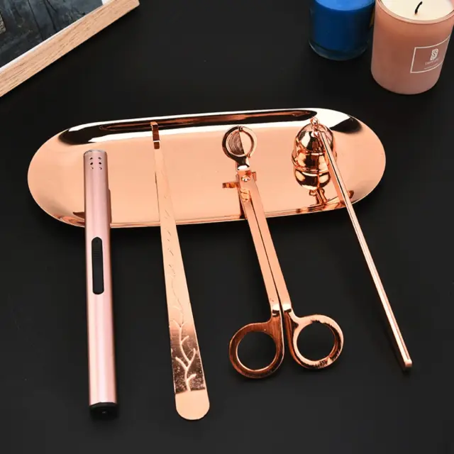 Celovita nega sveč: Ta 4-delni komplet za nego sveč ponuja vsa bistvena orodja za vzdrževanje vaših sveč in zagotavljanje čistega in dolgotrajnega gorenja. Komplet vključuje trimer za stenj, potopnik za sveče, dušilec za sveče in eleganten pladenj za organizirano shranjevanje. Uporabite trimer za stenj, da odrežete odvečni stenj in preprečite dimljenje, saje in tuneliranje. Potopnik za sveče pogasi plamen brez dima, medtem ko dušilec ponuja klasično metodo gašenja. Naj vaše sveče gorijo lepo in varno s tem celovitim kompletom dodatkov za sveče, izdelanim iz visokokakovostnega nerjavečega jekla. Idealen za vsakega ljubitelja sveč.