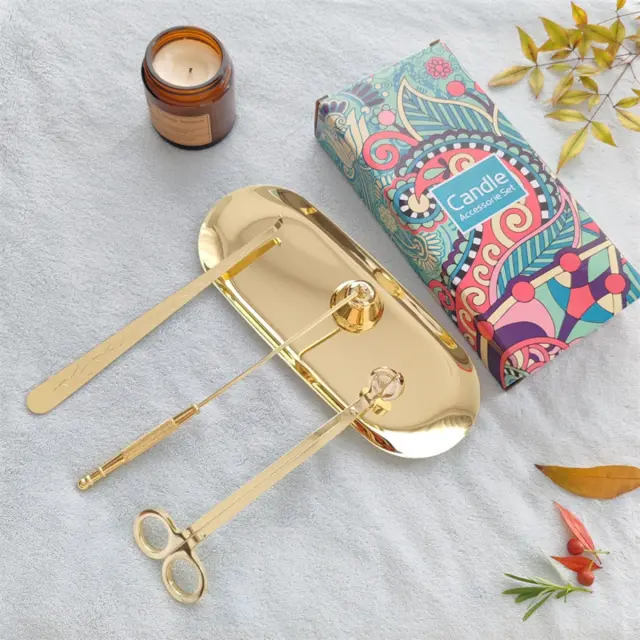 Celovita nega sveč: Ta 4-delni komplet za nego sveč ponuja vsa bistvena orodja za vzdrževanje vaših sveč in zagotavljanje čistega in dolgotrajnega gorenja. Komplet vključuje trimer za stenj, potopnik za sveče, dušilec za sveče in eleganten pladenj za organizirano shranjevanje. Uporabite trimer za stenj, da odrežete odvečni stenj in preprečite dimljenje, saje in tuneliranje. Potopnik za sveče pogasi plamen brez dima, medtem ko dušilec ponuja klasično metodo gašenja. Naj vaše sveče gorijo lepo in varno s tem celovitim kompletom dodatkov za sveče, izdelanim iz visokokakovostnega nerjavečega jekla. Idealen za vsakega ljubitelja sveč.