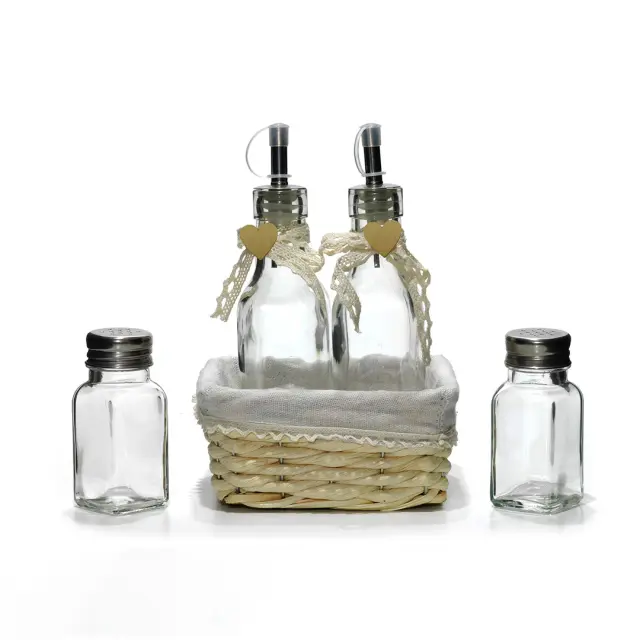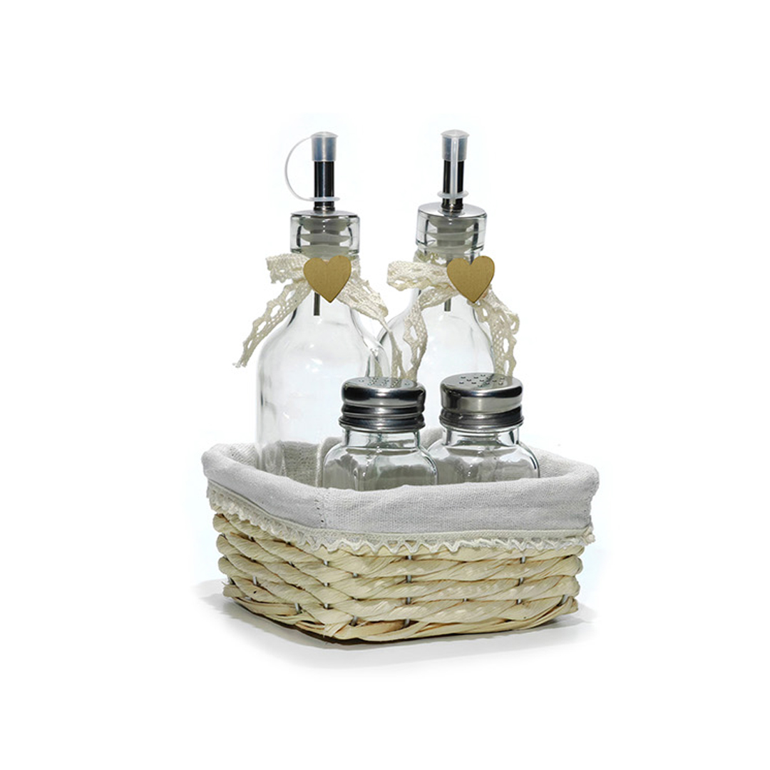 4-delni namizni set sestavljata: 2 steklenici za olje in kis z dozirnikom iz nerjavečega jekla, ki je odporen proti rji in 2 steklena stresalnika za sol in poper s pokrovom iz nerjavečega jekla. Košara poskrbi za dodaten okras. Primerno za pomivanje v pomivalnem stroju (brez košare).