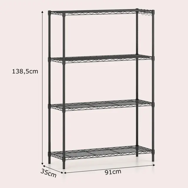 Izboljšajte svojo organizacijo s kovinskim regalom, ki odlično združuje vzdržljivost in priročnost. Ta 4-nivojska kovinska regalna enota ima nastavljive police, ki so med seboj oddaljene 2,5 cm, in omogoča shranjevanje predmetov različnih velikosti. Trpežen in robusten kovinski okvir z žičnatimi mrežami v obliki črke V zagotavlja močno oporo in zanesljivost. Hitra montaža brez orodja olajša postavitev, medtem ko kompleti proti prevračanju in nastavljive podloge za noge zagotavljajo dodatno stabilnost. Organizirajte svoj dom s tem robustnim kovinskim regalom, ki bo poskrbel za varen in urejen prostor.