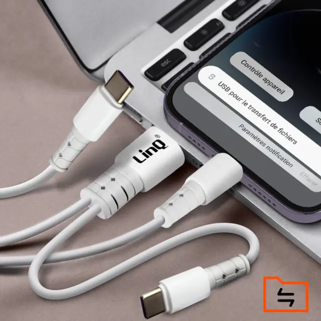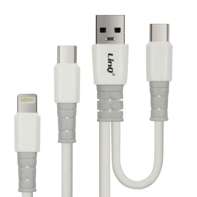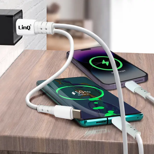 Dvojni vhod USB-A / USB-C v USB-C / Lightning kabel podjetja LinQ za polnjenje vseh vaših mobilnih naprav z vrati USB-C in Lightning na katerem koli viru napajanja. Njegova moc 60 W s tehnologijo Power Delivery zagotavlja hitro polnjenje.