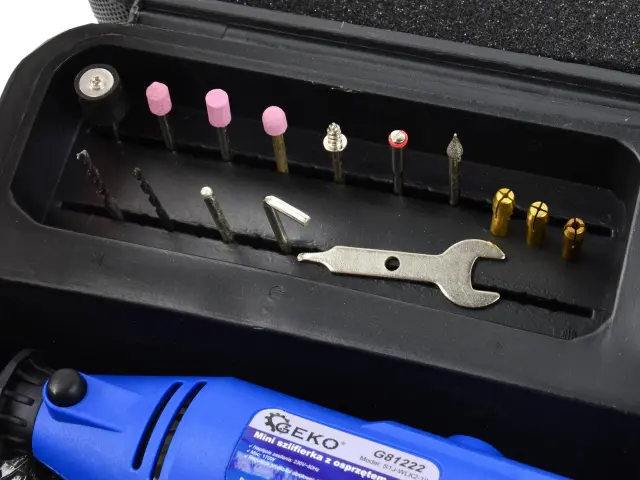 Večnamenski mlinček s kompletom dodatkov 40 kos. Naprava je opremljena s 170 W elektromotorjem z gladko regulacijo hitrosti v območju 15.000-35.000 vrt/min.