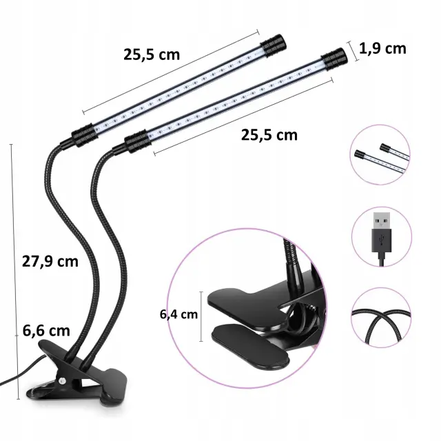 SPECIFIKACIJA – časovnik: 3, 9 in 12h; število LED: 40; moč žarnice: 5V; napajanje: USB; vodoodporen: IP 54; gibljive roke: da; barva oddajanja: rdeča in modra; Vrsta LED: rdeča – 630 nm, modra – 470 nm; 2 svetlobni plošči; moč: 20 W; kot nagiba do 180 stopinj; nastavitev jakosti osvetlitve: da, 9 stopenj; mere: 68 x 12 x 7 cm, teža: 280 g; teža z embalažo: 488 g.