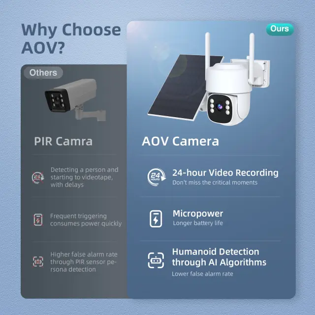 Pametne varnostne funkcije: Bodite obveščeni in zaščiteni s pametnimi varnostnimi funkcijami te 4G solarne varnostne kamere. AOV solarna kamera je opremljena z alarmom za zaznavanje gibanja, ki vas takoj opozori na vsako sumljivo dejavnost na vaši lastnini. Prejemajte potisna obvestila APP v realnem času na vaš pametni telefon, kar vam omogoča takojšnje ukrepanje. Kamera podpira tudi dvosmerni zvok, ki vam omogoča komunikacijo z obiskovalci ali odvračanje potencialnih vsiljivcev na daljavo. Poleg tega funkcija zvočnega in svetlobnega alarma dodaja dodatno raven varnosti, saj odvrača neželene goste z zvočnimi in vizualnimi opozorili. Te pametne funkcije zagotavljajo proaktiven pristop k varnosti, ki zagotavlja, da je vaša lastnina vedno zaščitena.