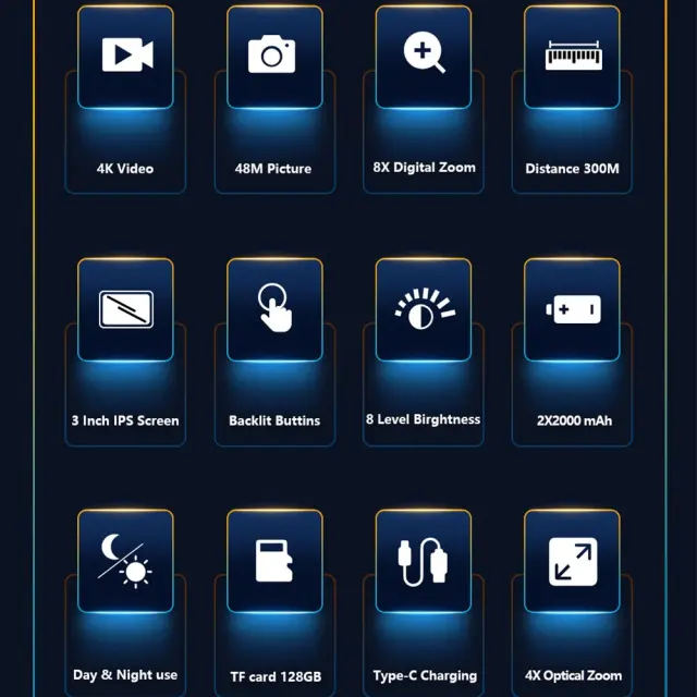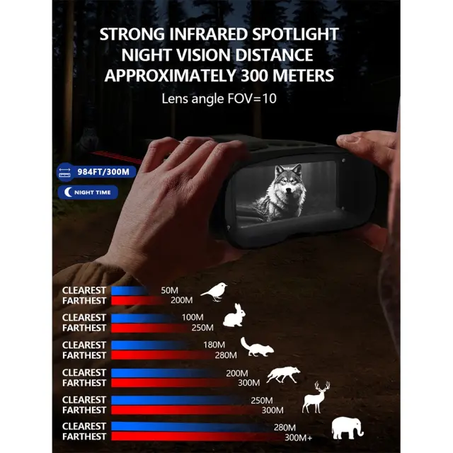 Superior Night Vision Clarity: Doživite neprimerljivo jasnost v popolni temi z našim 4K digitalnim daljnogledom za nočno opazovanje. Opremljen z močnim 3W 850nm infrardečim osvetljevalnikom s 7 nastavljivimi stopnjami, vam ta daljnogled omogoča, da vidite do 250-300 metrov v popolni temi. Idealen za nočno opazovanje divjih živali, lov ali varnostni nadzor, napredna infrardeča tehnologija zagotavlja jasne in podrobne slike, kar izboljšuje vašo vidljivost in zavedanje o situaciji. Kombinacija optičnih in digitalnih zmogljivosti povečave omogoča podrobno opazovanje oddaljenih predmetov, zaradi česar je idealno orodje za različne dejavnosti na prostem in profesionalne aplikacije. Uživajte v kristalno jasnih vizualnih elementih tudi v najtemnejših okoljih.