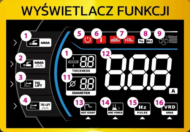 Funkcija VRD za način MMA. Ta funkcija zmanjša izhodno napetost na 20 V brez obremenitve na varno raven, s čimer odpravi nevarnost električnega udara. Funkcijo izberete s kratkim pritiskom na gumb.