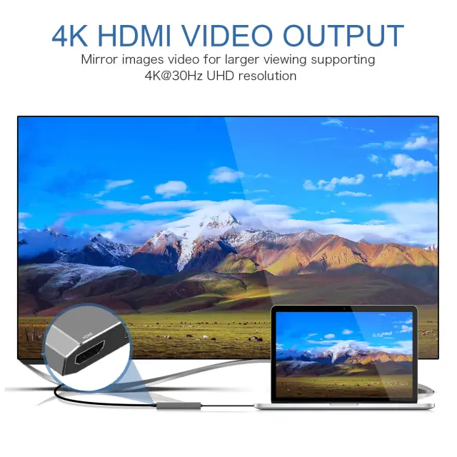 Kristalno čist 4K HDMI: Uživajte v osupljivi sliki s priključkom HDMI, ki podpira ločljivosti do 4K Ultra HD (3840 x 2160) pri 30 Hz. Pretakajte vsebino visoke ločljivosti iz prenosnika na zunanji monitor ali televizor za izjemno izkušnjo gledanja.