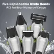 Vodoodporen in polnljiv: Celoten komplet za urejanje je vodoodporen, kar omogoča enostavno čiščenje in uporabo pod prho. Vgrajena litijeva baterija 1200 mAh zagotavlja 120-150 minut delovanja po samo 2 urah polnjenja prek USB. Ta dolgotrajna baterija zagotavlja, da je naprava vedno pripravljena, ko jo potrebujete, ne glede na to, ali ste doma ali na poti. Vodoodporna zasnova omogoča tudi enostavno in higienično vzdrževanje.