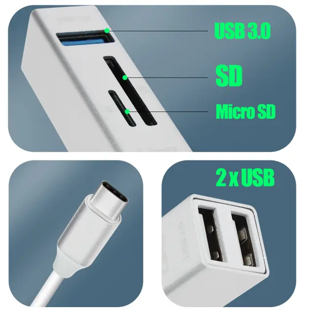 To LinQ USB-C HUB vam omogoca povezavo vec naprav na vaš Macbook/pametni telefon: miško, tipkovnico ali kljuc USB, pomnilniško kartico SD in Micro-D. Uživajte v prenosu podatkov do 5 Gbps. Rocna kompaktna oblika.