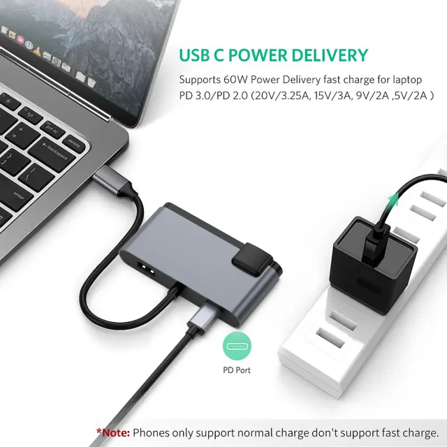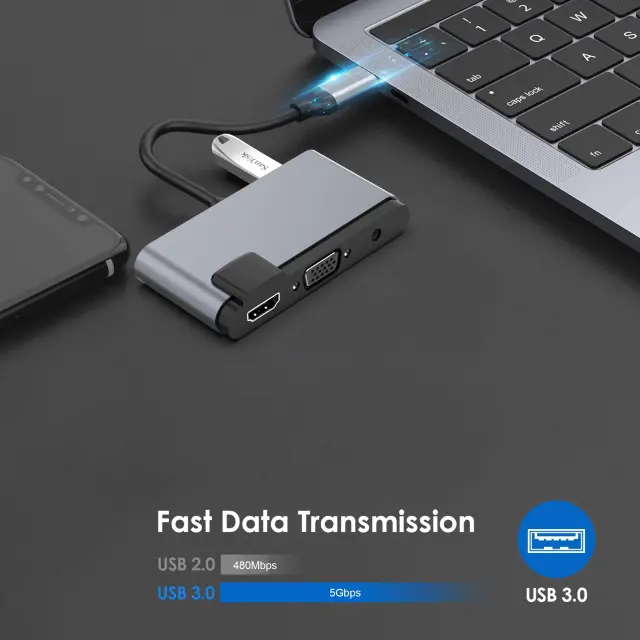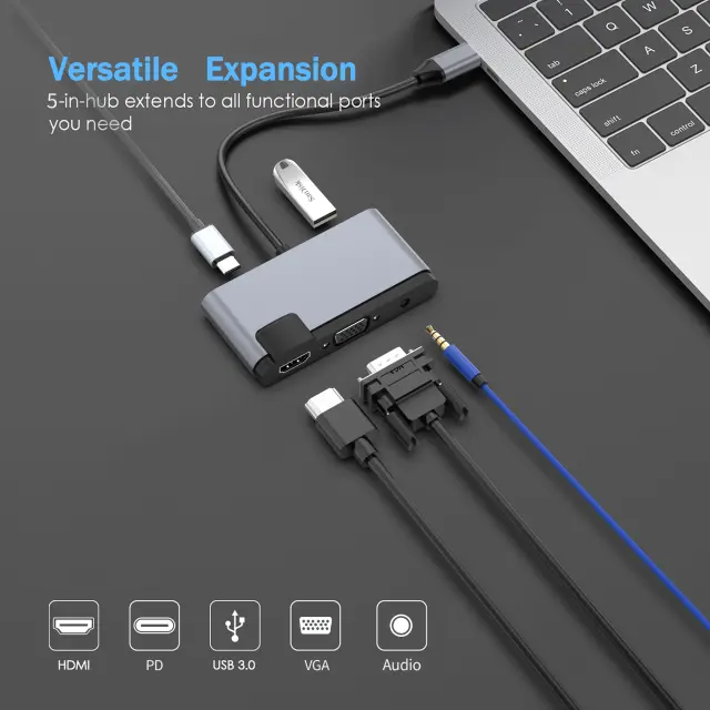 Vsestranska povezljivost: To 5-v-1 zvezdišče spremeni vaša vrata USB-C v večnamensko zvezdišče, ki zagotavlja brezhibno povezljivost za različne naprave. Z vrati USB 3.0, HDMI, VGA, zvokom in polnjenjem USB-C PD lahko prenosni računalnik povežete z zunanjimi zasloni, projektorji, slušalkami in drugimi napravami, vse iz enega samega zvezdišča.