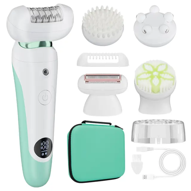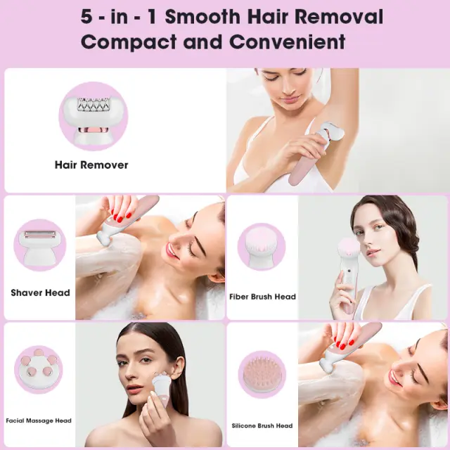 Vsestranska Zasnova 5-v-1: Ta brivnik za polnjenje ima pet zamenljivih glav, ki ustrezajo vsem vašim potrebam po odstranjevanju dlak in negi kože. Vključuje glavo ženskega brivnika za gladko britje, glavo epilatorja za dolgotrajno odstranjevanje dlak, krtačo za čiščenje obraza za globinsko čiščenje, masažno glavo za sprostitev in bikini trimer za natančno urejanje. Ta vsestranska naprava poenostavi vašo lepotno rutino in vam prihrani čas in denar. Zasnova 5 v 1 zagotavlja, da imate pravo orodje za vsako nalogo, od odstranjevanja dlak na obrazu do odstranjevanja dlak po celem telesu.
