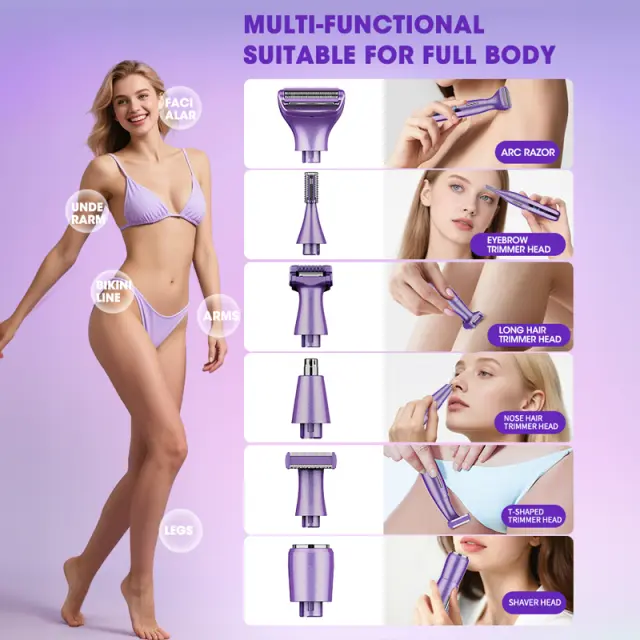 Vsestranski komplet za urejanje: Ta 5-v-1 ženski prirezovalnik dlak ponuja celovito rešitev za urejanje za različne potrebe. Vključuje brivno glavo v obliki črke T, glavo za odstranjevanje dlak, glavo za prirezovanje obrvi, glavo za prirezovanje dlačic v nosu in brivno glavo. Ta obsežen komplet vam omogoča natančno in nežno odstranjevanje neželenih dlak z različnih delov telesa, kar zagotavlja gladko in udobno izkušnjo. Popoln za vzdrževanje osebne higiene in enostavno doseganje želenega videza.
