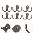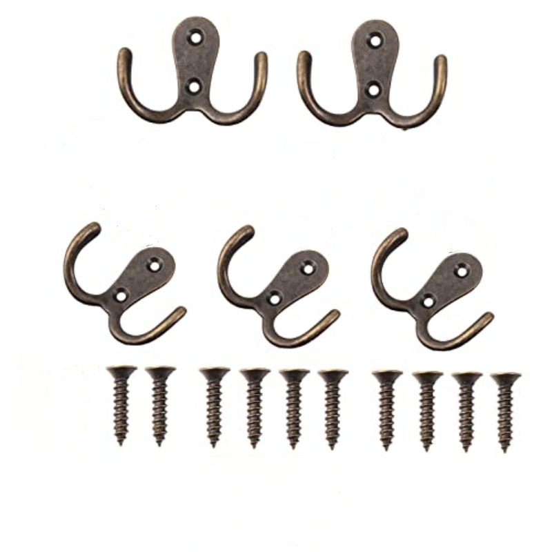 Stabilne stenske kljuke v prijetnem staromodnem dizajnu. Dvojni kavlji so izdelani iz visokokakovostne cinkove zlitine v barvi starinske medenine in so dobavljeni v paketu 5 kosov, vključno z 10 vijaki.