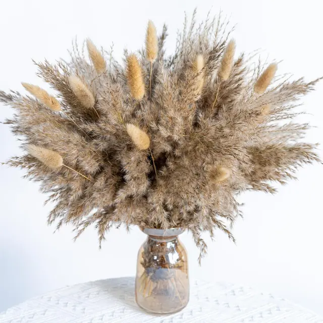 Naravna in dolgotrajna lepota: Uživajte v trajni lepoti naravnih posušenih cvetov s tem skrbno izbranim šopkom. Za razliko od svežih cvetov, ki ovenijo in zbledijo, ti posušeni cvetovi ohranijo svoj čar dlje časa in zagotavljajo dolgotrajno vizualno privlačnost. Pampas trava, zajčji repki in trst so natančno posušeni, da ohranijo svojo naravno obliko in barvo. To zagotavlja, da vaš cvetlični aranžma ostane živahen in očarljiv več mesecev. Popoln za tiste, ki cenijo lepoto narave brez potrebe po stalnem vzdrževanju. Ti posušeni cvetovi so trajnostna in okolju prijazna alternativa svežim cvetovom, ki ponujajo brezčasno in elegantno dekorativno rešitev.