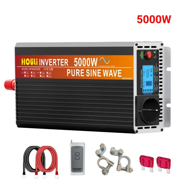 • Močan izhod: Ta inverter učinkovito pretvarja 12V (DC) vhod v 220-230V (AC) izhod, kar vam omogoča, da napajate različne naprave s skupno izhodno močjo 5000W.
