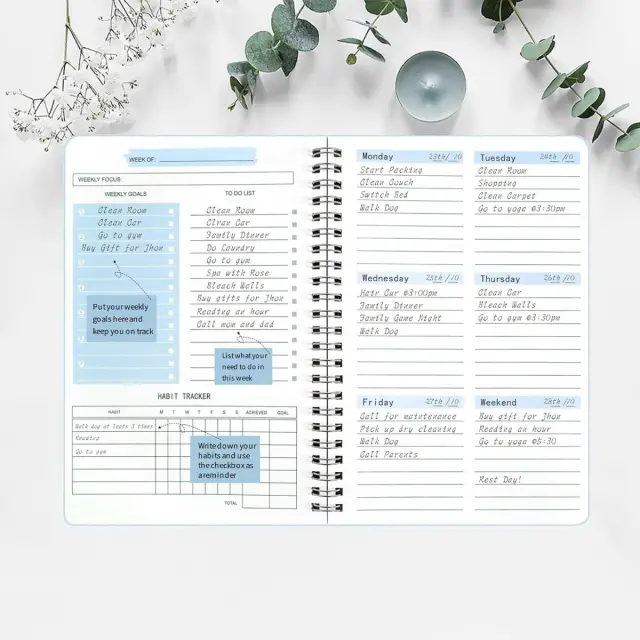 Celovita tedenska postavitev: Ta planer ima dobro strukturiran format dveh strani na teden in zagotavlja celovit pregled vašega urnika. Vsaka stran vključuje poseben odsek za seznam opravil in prostoren prostor za zapiske, kar vam omogoča učinkovito upravljanje vaših nalog in zajemanje vaših misli. Ta postavitev spodbuja uravnotežen pristop k načrtovanju, združuje strukturirano upravljanje nalog s prilagodljivostjo za beleženje idej in razmišljanj. Vključitev obeh elementov naredi ta planer neprecenljivo orodje za osebno in poklicno rast.