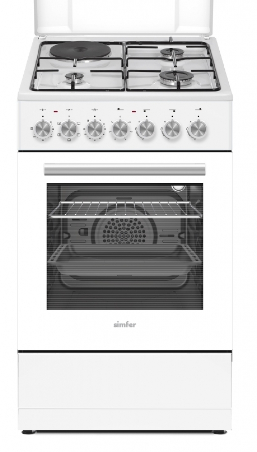 Prostostoječi kombinirani štedilnik Simfer 5315 SERBB v beli barvi in širine 50 cm se pohvali s svojo 43 litrsko ventilatorsko pečico s petimi programi peke, dvojno zasteklitvijo vrat, mrežno rešetko ter priloženim pekačem. Trije zmogljivi plinski gorilniki s samodejnim vžigom plina in električna kuhalna plošča zagotavljajo brezskrbno pripravo vaših najljubših kulinaričnih mojstrovin. Za varnost poskrbi varnostni plinski ventil, šobe plinskih gorilnikov pa so primerne za kuhanje s pomočjo zemeljskega plina ali jeklenke. Lepo oblikovani gumbi dajejo štedilniku eleganten videz, pokrov štedilnika pa preprečuje nabiranje umazanije na kuhalni površini.