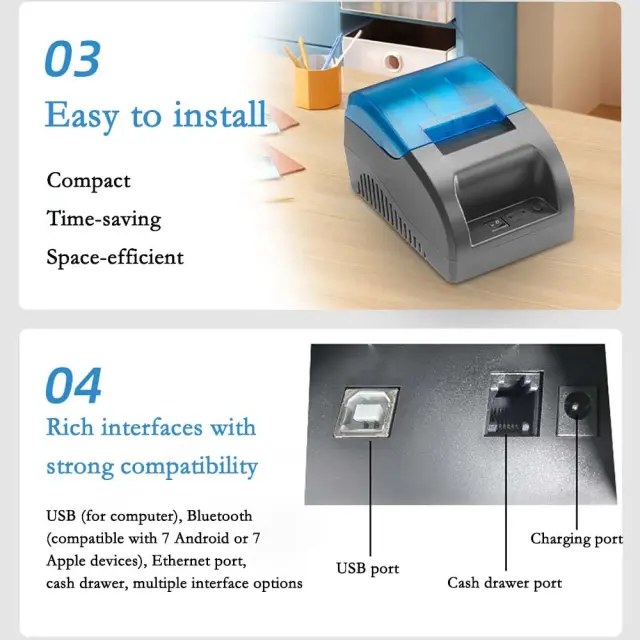 Vsestranske možnosti povezljivosti: Ta 58mm termalni tiskalnik računov ponuja brezhibno povezljivost prek Bluetootha in USB-ja, kar zagotavlja združljivost s široko paleto naprav. Podpira operacijske sisteme Android, iOS in Windows, zaradi česar je idealen za različna poslovna okolja. Dvojne možnosti povezljivosti zagotavljajo prilagodljivost in zanesljivost, kar vam omogoča enostavno tiskanje računov s pametnega telefona, tablice ali računalnika. Popoln za maloprodajo, gostinstvo in druge panoge, ki zahtevajo rešitve za tiskanje na poti ali stacionarno. Izkusite tiskanje brez težav s to vsestransko in učinkovito napravo.