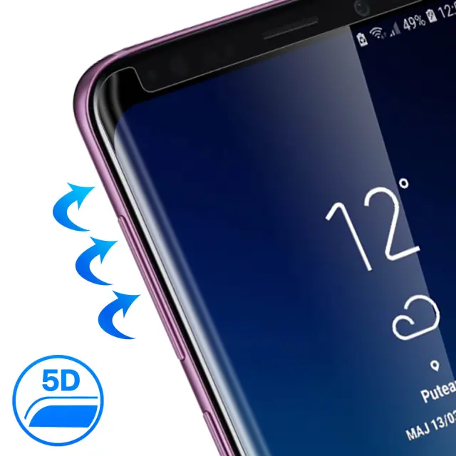 5x zaščitno steklo iz utrjenega stekla, predhodno izrezano za Samsung Galaxy S9. Tehnologija 5D Full Cover za bolj obdajajočo zaščito. Ukrivljen zaključek: popolnoma se prilega oblinam zaslona. Visok indeks trdote 9H: izjemno odporen na praske, udarce, ostre predmete.