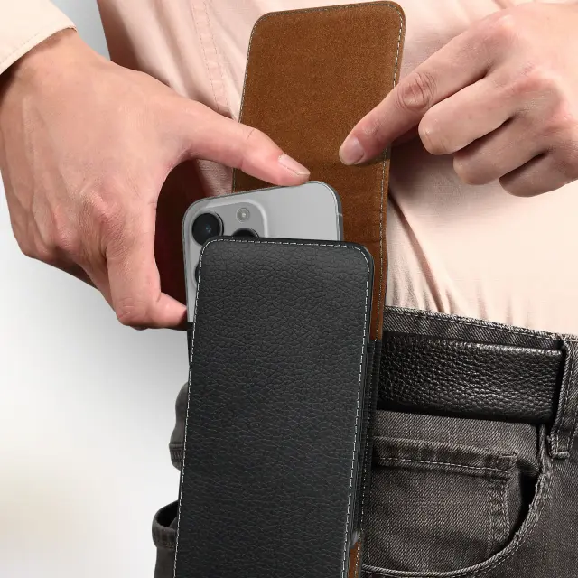 Crna torbica za pas, zasnovana za prenašanje vašega pametnega telefona povsod, ne da bi vas obremenjevala. Ovitek z zanko za pas za prakticen in varen transport. Popolnoma združljiv s katerim koli pametnim telefonom do 6,5 palca.