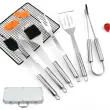 Pripravljeno za uporabo na prostem: Komplet orodij za žar iz nerjavečega jekla, ki je izrecno opisan kot komplet pripomočkov za žar na prostem, je namenjen uporabi pri peki na žaru na prostem. Komponente kompleta – šest lopatic za žar in škatla za shranjevanje – ustrezajo običajnim zahtevam za orodje za žar na prostem in so primerne za kampiranje, peko na žaru na dvorišču in druge dejavnosti na prostem. Besedilo ohranja izvorno podrobnost, da gre za srebrn 6-delni komplet lopatic za žar z aluminijastim ohišjem in se osredotoča na praktično uporabo pri peki na žaru na prostem in v rekreacijskem okolju.