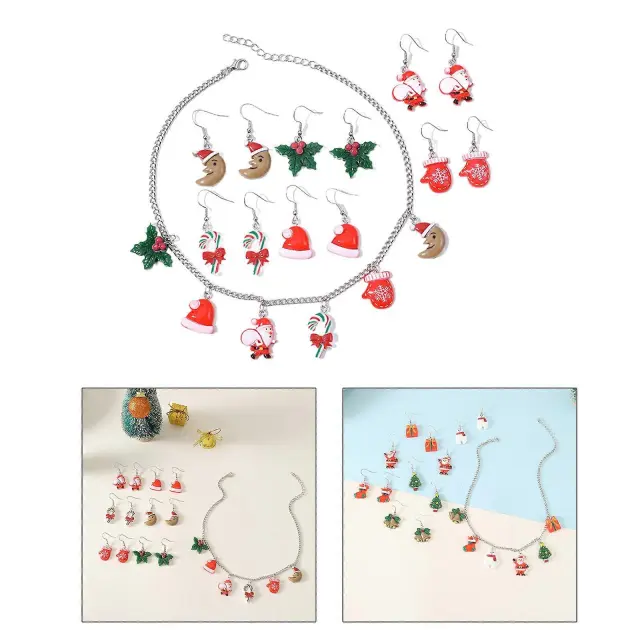 6 parov božičnih visečih uhanov z 1 ogrlico za ženske, božična ogrlica in uhani, božični komplet nakita B