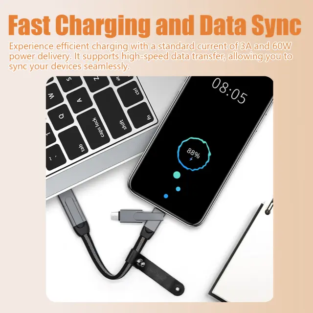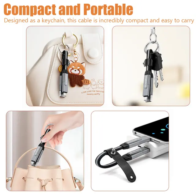 Kompakten in prenosljiv: Ta kabel, zasnovan kot obesek za ključe, je neverjetno kompakten in enostaven za prenašanje. Zavzame minimalno prostora v žepu ali torbi, kar zagotavlja, da imate vedno pri roki rešitev za polnjenje in prenos podatkov.