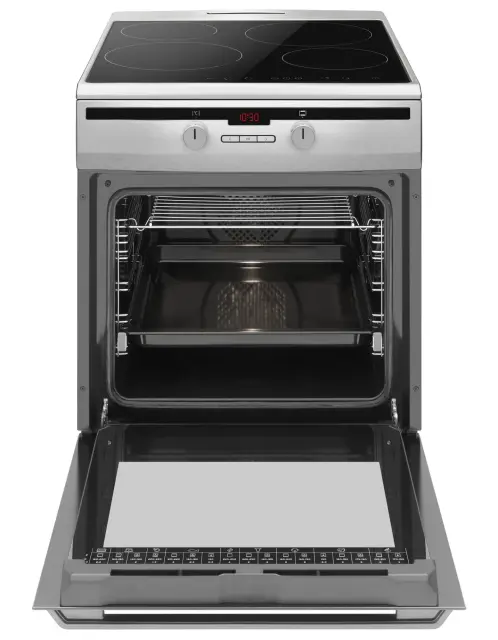 Prostostoječi indukcijski štedilnik Amica 6118IE2.376HTaDp(Xx) navdušuje s svojimi zmogljivimi štirimi kuhališči premera 2 x 16 cm in 2 x 21 cm ter štirikratno funkcijo Booster za hitro segrevanje. Izjemen nadzor kuhališča omogoča funkcija za ohranjanje toplote s tremi stopnjami temperature 42 °C, 74 °C, 94 °C in samodejnim uravnavanjem vrenja. Štedilnik odlikuje 77 litrska ventilacijska pečica z enim nivojem teleskopskih vodil s 75-odstotnim izvlekom, 9 programov peke, LED-zaslon z nadzorom časa peke, predlogi za peko na notranji strani vrat, posebej močna halogenska osvetlitev in hladna vrata s trojnim steklom (43°C). Mrežna rešetka in globok pekač zagotavljata udobno pripravo jedi, dodaten prostor za shranjevanje pa omogoča predal na vodilih na dnu štedilnika. Kuhinjski štedilniki Amica v kuhinjo vnašajo svežino in lahkotnost kakovostne in hitre priprave jedi na enem mestu, inox barva s kombinacijo črnega stekla pa se poda v prav vsako moderno kuhinjo.
