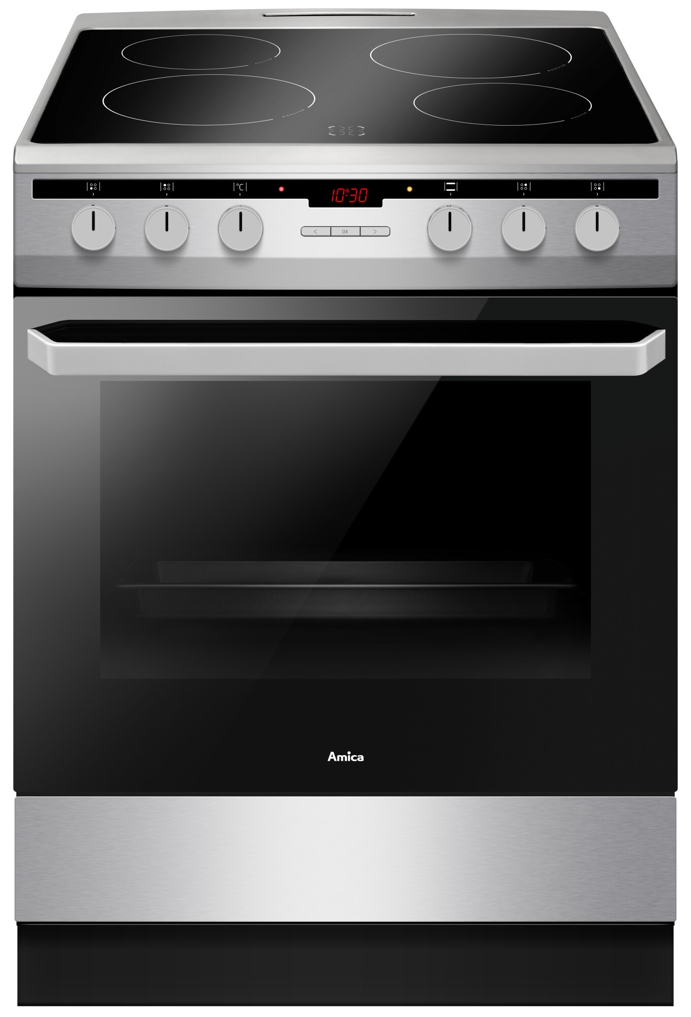 Prostostoječi steklokeramični štedilnik Amica 618CE3.333HTaQ(Xx) navdušuje s svojimi 4 steklokeramični kuhališči premera 2 x 14,5 cm, 1 x 18 cm in 1 x 21 cm s pomočjo katerih kuhanje postane preprosto opravilo. Štedilnik odlikuje 62 litrska ventilacijska pečica, 10 programov peke, LED elektronska programska ura, hitro segrevanje - 150°C v 4 minutah, odtaljevanje, predlogi za peko na notranji strani vrat in hladna vrata s trojnim refleksnim steklom. Za higieno ob pripravi vaših najljubših jedi poskrbijo možnost preprostega parnega čiščenja, emajl za lažje čiščenje – EasyClean, katalitične obloge v notranjosti pečice in sistem vrat za lažje čiščenje. Mrežna rešetka, globok in plitek pekač zagotavljajo udobno pripravo jedi, dodaten prostor za shranjevanje pa omogoča predal na vodilih na dnu štedilnika. Kuhinjski štedilniki Amica v kuhinjo vnašajo svežino in lahkotnost kakovostne in hitre priprave jedi na enem mestu, inox barva s kombinacijo črnega stekla pa se poda v prav vsako moderno kuhinjo.